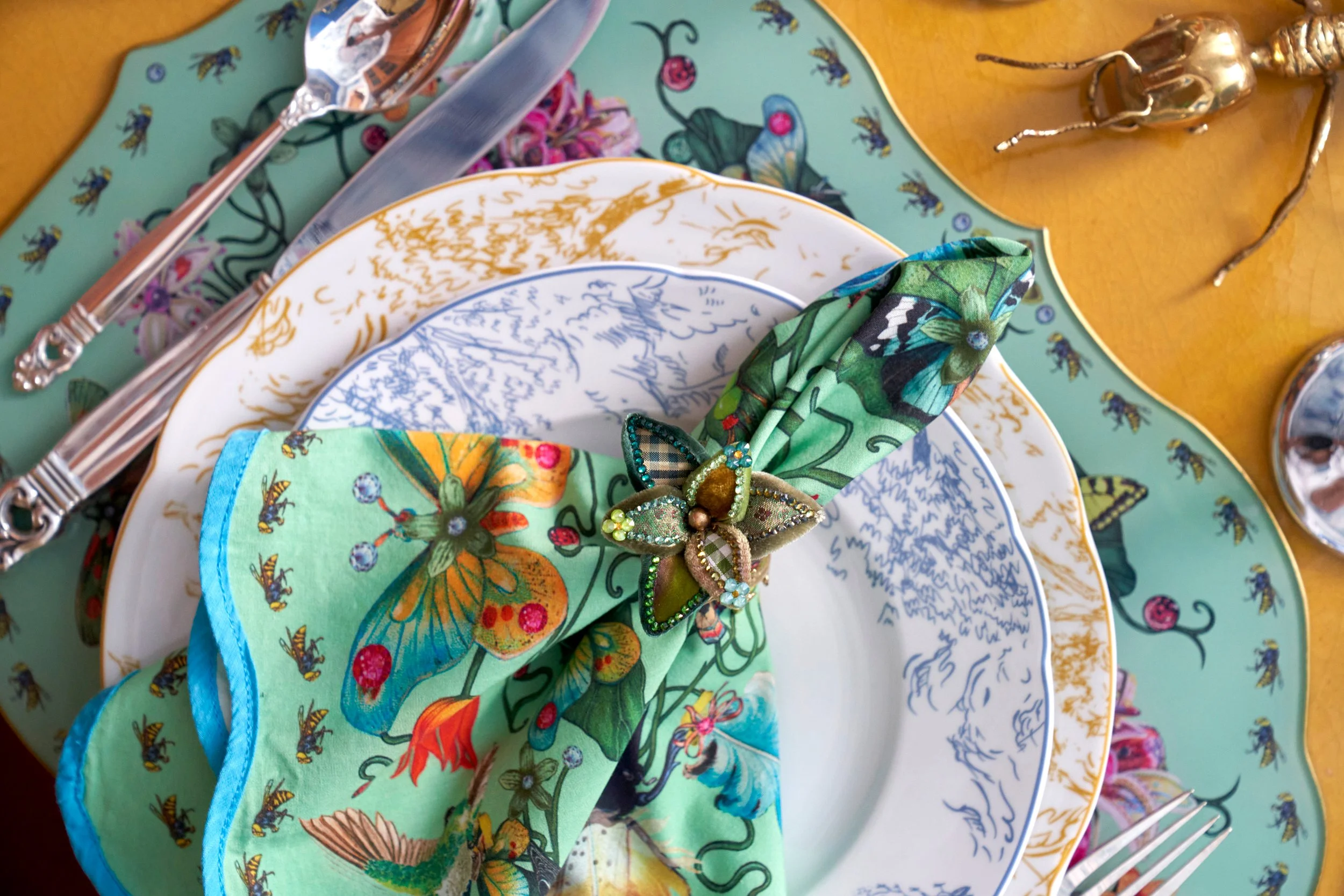 In 2019, Elizabeth took her deep knowledge of couture fashion and borrowed from its emphasis on luxury and imaginative uses of material to create Elizabeth Hayt Studio, a high-end home decor collection. Weaving together elaborate compositions and material finery, from metallic brocade to glittery tulle to Swarovski crystals to vintage millinery plumes, her work evokes the spirit of the baroque along with archly feminine ornamentation. These elegant and yet extravagant faux flora inspired her recent tabletop collections which are available at Bergdorf Goodman. Her designs have been featured in Elle Decor, NYC Cottages and Garden, Hamptons Magazine and others.